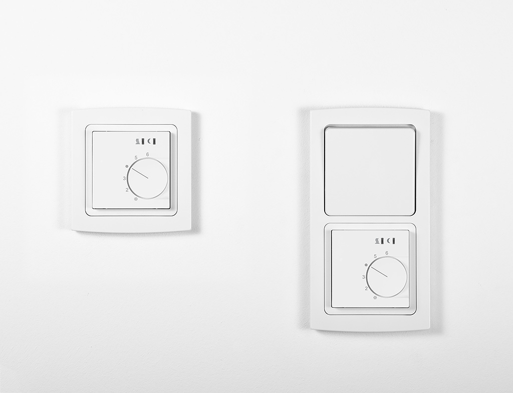 RTR-5542 (rg) Raumtemperaturregler u.P., 230 V AC, einschl. Zentralscheibe, ohne Abdeckrahmen, für Stellantriebe stromlos offen und stromlos geschlossen, Triac-Ausgang für max. 5 Stellantriebe (3W elektromechanisch), mit TA-Eingang (3,5°C), Einstellbereich 5-30°C mit Bereichseinengung, mit Berührungsschutzkappe, Anschluss für 230V-Eingangssignal Heizen/Kühlen (Change Over) vom gleichen FI und LS, einschl. LED (rot: Heizen, grün: Temperaturabsenkung ein, blau: kühlen), Farbe: reinweiß glänzend, ähnlich RAL9010, passend in folgende Schalterprogramme: Busch-Jaeger balance SI, Gira System 55, Jung Serie A und AS, Berker Serie S.1 / B.3 / B.7, Merten Serie System M, Elso Joy. Maximale Leitungslänge für Heizen/Kühlen-Eingang: 100 m. Im Falle größerer Leitungslängen ist u.U. ein Entstör-Kondensator 0,33 Mikrofarad zwischen Steuerleitung Heizen/Kühlen und Neutralleiter erforderlich.