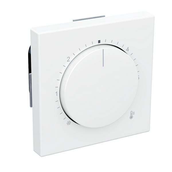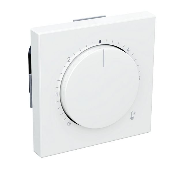 RTR-7010 (rm) Raumtemperaturregler u.P., 230 V AC, einschl. Zentralscheibe passend für JUNG-Schalterprogramme der Serie LS [LS 990, LS ZERO], ohne Abdeckrahmen, Farbe schneeweiß matt, ähnlich RAL9010, Öffnerkontakt 10(4)A, Einstellbereich 5-30°C mit Bereichseinengung, Temperaturabsenkung, Berührungsschutzkappe, für Stellantriebe stromlos geschlossen