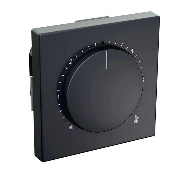 RTR-7020 (swm/JU) Raumtemperaturregler u.P., 230 V AC, einschl. Zentralscheibe passend für JUNG-Schalterprogramme der Serie LS [LS 990, LS ZERO], ohne Abdeckrahmen, Farbe (graphit-)schwarz matt, Wechslerkontakt 10(4)A Heizen, 5(2) A Kühlen, Einstellbereich 5-30°C mit Bereichseinengung, Temperaturabsenkung, Berührungsschutzkappe, für Stellantriebe stromlos geschlossen & stromlos offen